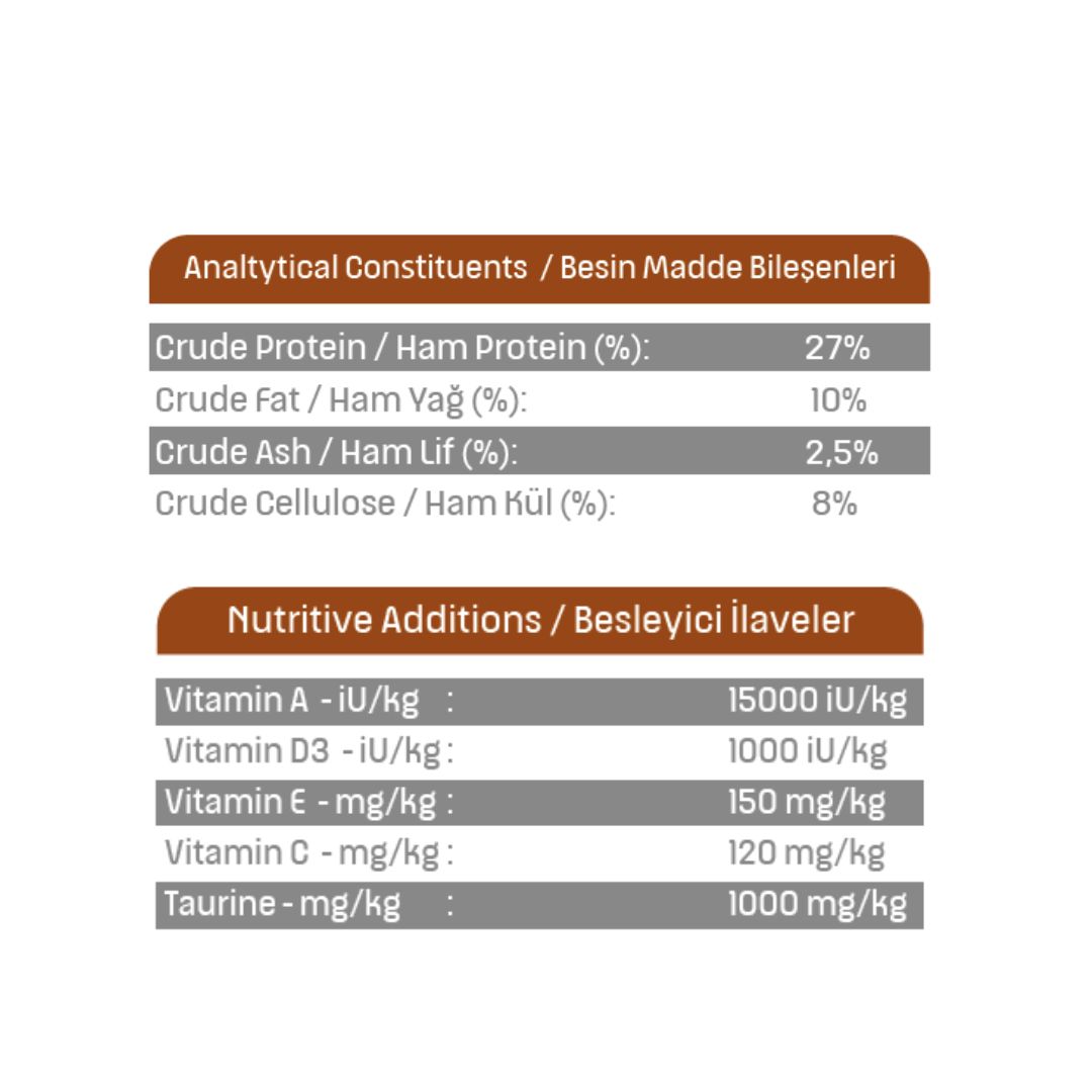 Vitaminler / Vitamins: Vit.A, Vit.D, Vit.E, Vit.C, Vit.B1, Vit.B2, Vit.B3 (Niacin), Vit.B6, Vit.B12, Vit.B7 (Biotin), Vit.B9 (Folic Asid), Vit.K, Choline, Calcium Pantothenate.