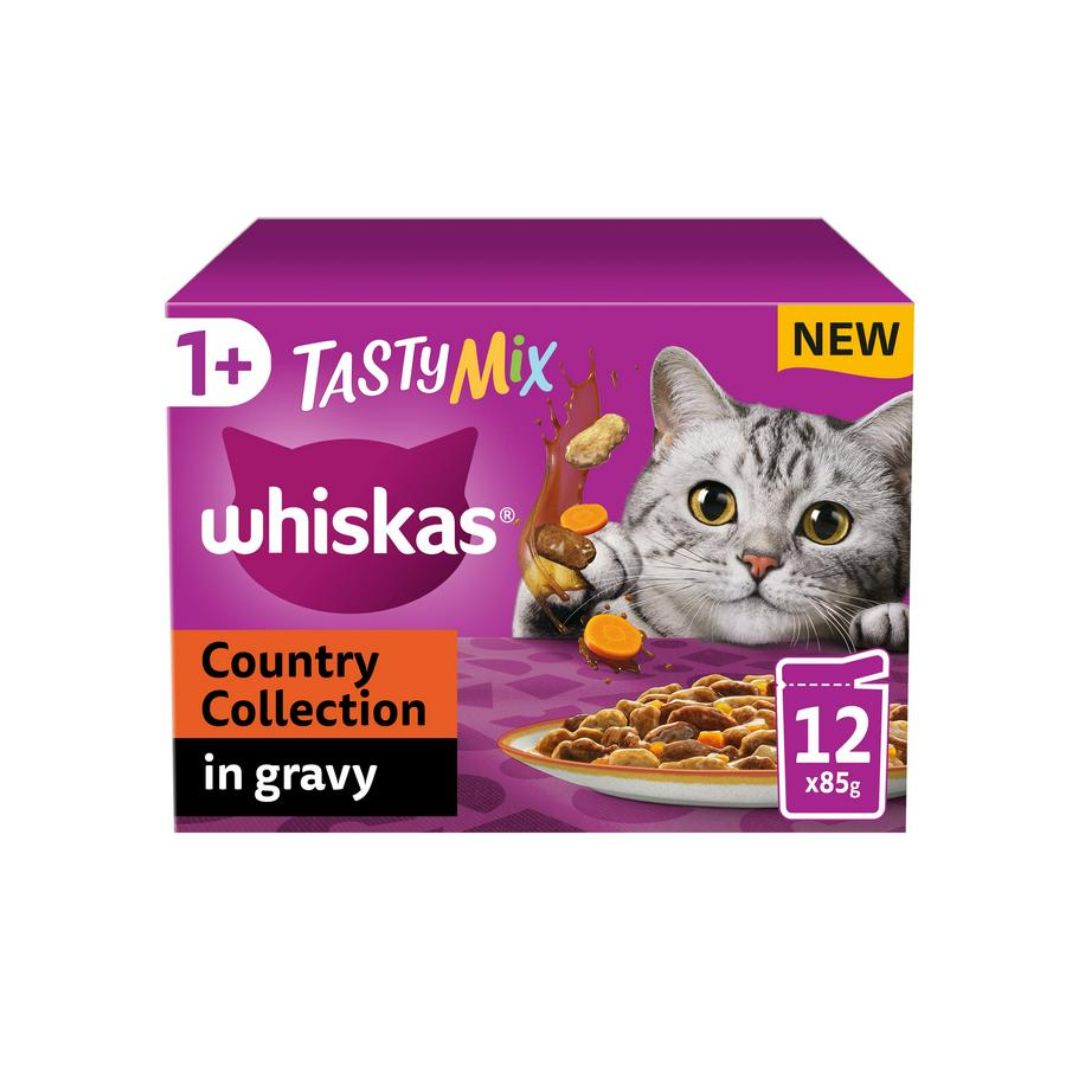 WHISKAS TASTY MIX Country Collection 1+ adult cat food pouches in gravy are specially prepared to preserve the natural goodness and deliciousness of high quality ingredients and will see your cat rush to the bowl faster than ever before! Made with sustainably sourced ingredients, these cat food pouches contain everything your cat needs to keep them happy and healthy 100% of your cat’s daily needs, for adult 1+ cats. 12 x 85g pouches.