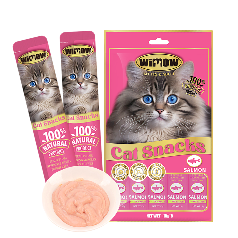 Wimow Kitten and Adult Cat Snacks Salmon 15g is a grain-free, starch-free treat for both kittens and adult cats. It comes in a 5-stick pack, with each stick weighing 15 grams. The main ingredient is salmon, which is a good source of protein and omega-3 fatty acids. Other ingredients include water, natural flavor, taurine, vitamin A, vitamin B12, vitamin D3, and vitamin E.